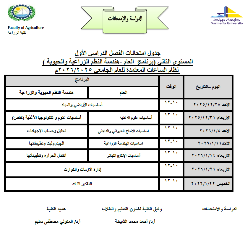 جدول إمتحانات المستوى الأول الفصل الدراسي الثانى - العام الجامعى 2023-2024